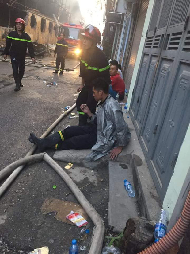 Sáng sớm nay khi ngọn lửa đã được khống chế, những chiến sĩ PCCC mới bắt đầu thay phiên nhau nghỉ ngơi sau 1 đêm dài chiến đấu với lửa. Không cần gối cũng chẳng cần chăn, các anh chỉ nghỉ ngơi bằng cách gục đầu trên thềm cửa hoặc ngả lưng ra giữa vỉa hè, có lẽ lúc này 1 giấc ngủ dù vội vàng cũng vô cùng quý giá.