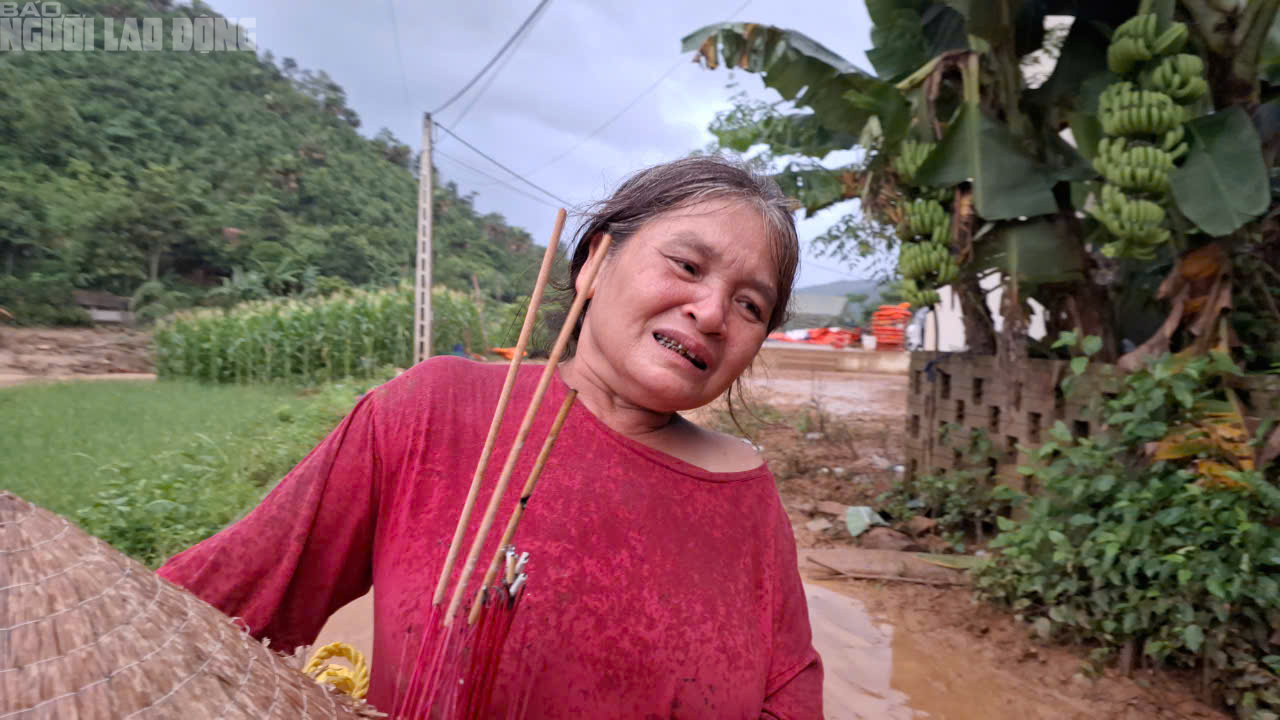 Bà Hoàng Thị Sời, 58 tuổi, tay ôm bát nhang, vừa đi vừa khóc nấc dưới trời mưa nặng hạt. Phía trước, những người thân đang khiêng một cỗ quan tài. 4 người thân của bà Sời gồm con dâu cả và 3 đứa cháu đã mất trong trận lũ kinh hoàng sáng 10-9. Hiện cả gia đình chỉ còn bà may mắn không sao, còn lại đều bị thương đang đi cấp cứu ở viện.
