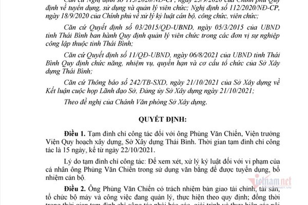 Như đã đưa tin, ngày 21/10, Giám đốc Sở Xây dựng Thái Bình Nguyễn Quang Anh đã ký quyết định tạm đình chỉ công tác đối với ông Phùng Văn Chiến, Viện trưởng Quy hoạch xây dựng, thời hạn 15 ngày.
