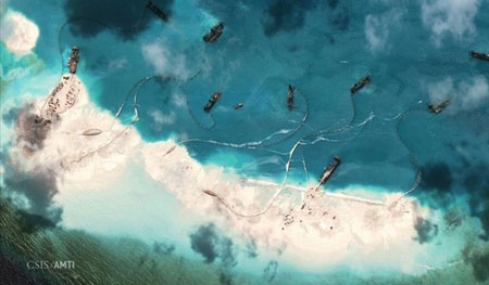 | Một bức ảnh vệ tinh cho thấy hoạt động cải tạo trái phép của Trung Quốc ở bãi Vành Khăn thuộc quần đảo Trường Sa của Việt Nam - Ảnh: Reuters |