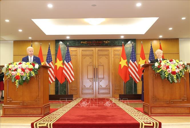 Phát biểu với báo chí sau Hội đàm, Tổng Bí thư Nguyễn Phú Trọng và Tổng thống Mỹ Joe Biden cho biết hai bên đã có cuộc hội đàm rất thành công và đã nhất trí nâng cấp quan hệ hai nước lên Đối tác Chiến lược Toàn diện vì hoà bình hợp tác phát triển bền vững.