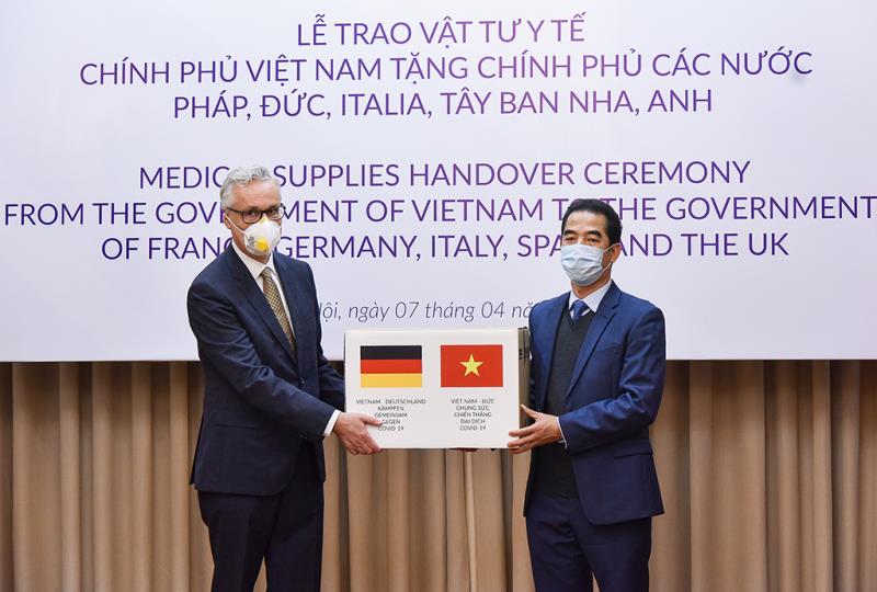 Theo thông tin từ Bộ Ngoại giao, thừa ủy quyền của Thủ tướng, chiều 7/4, Thứ trưởng Ngoại giao Tô Anh Dũng đã trao số hàng hỗ trợ phòng chống dịch Covid-19 của Chính phủ và nhân dân Việt Nam gửi tặng Chính phủ và nhân dân các nước Pháp, Đức, Italy, Tây Ban Nha và Anh, bị ảnh hưởng nặng nề của dịch bệnh Covid 19.