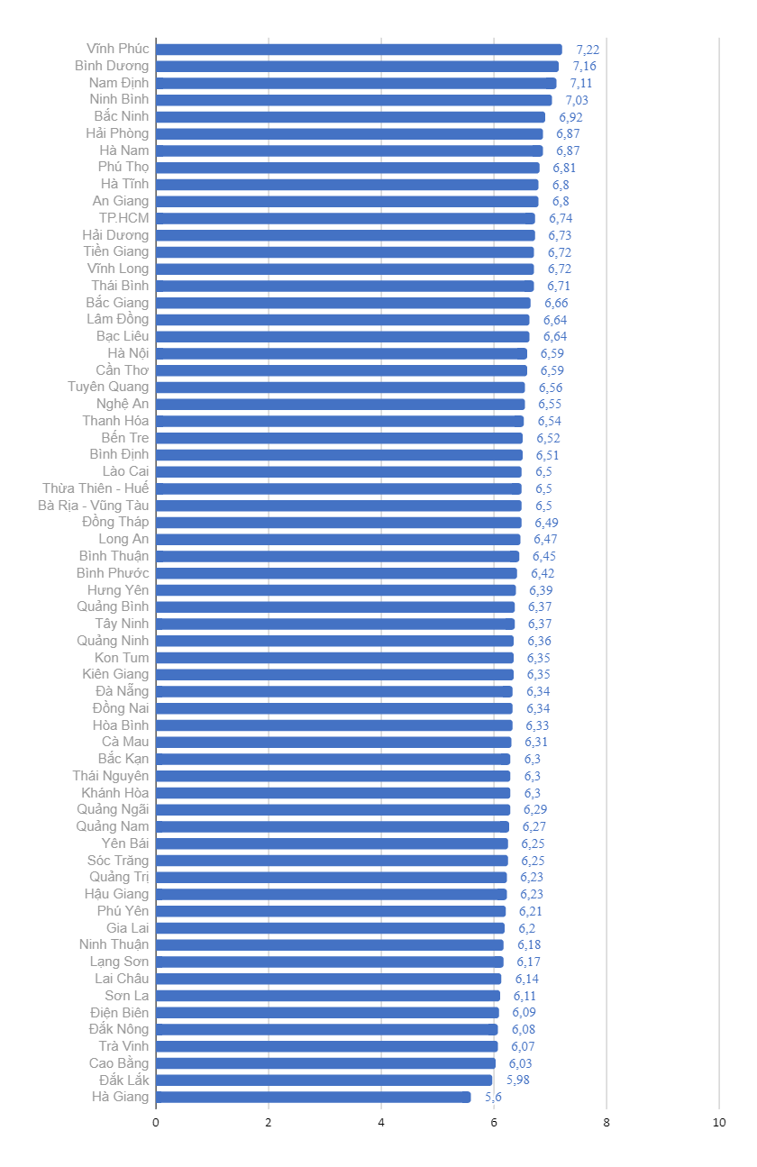 Địa phương đứng thứ 2 là Bình Dương với 7,161 điểm, và thứ ba là Nam Định với 7,109.