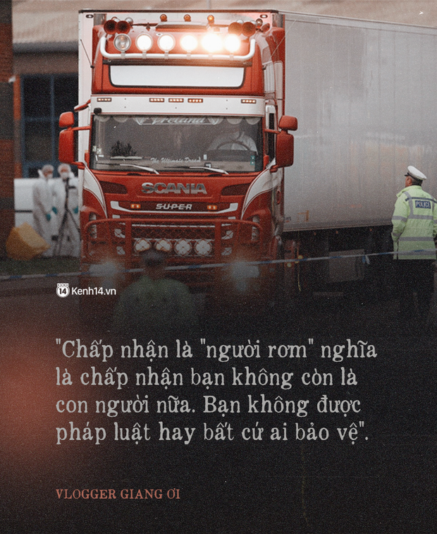 Chia sẻ về cuộc sống của những người trốn trót lọt sang Anh, Vlogger Giang Ơi cho hay, "Những người trốn được sang Anh thì người ta phải sống và làm việc một cách chui lủi. Khi không có giấy tờ thì các bạn sẽ phải sống chui, làm việc chui và các giao dịch đều phải bằng tiền mặt. Các bạn sẽ không thể nào sinh hoạt như người bình thường và không có địa chỉ ở chính thức. Họ sẽ phải đi thuê nhà chui hoặc nhờ sinh viên đi thuê nhà và đứng tên giùm, thẻ đi tàu, thẻ ngân hàng đều phải đi mua của người khác.