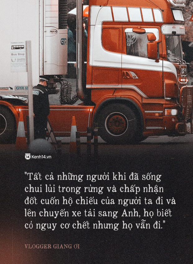 "Tất cả những người khi đã sống chui lủi trong rừng và chấp nhận đốt cuốn hộ chiếu của người ta đi và lên chuyến xe tải dang Anh người ta biết có nguy cơ chết nhưng họ vẫn đi. Bởi bao nhiêu anh em họ hàng đã sang trót lọt và cuộc sống đỡ khổ hơn ở quê. Thực sự tỉ lệ sống chết là bao nhiêu thì mình không biết, chính phủ không biết, các bạn không biết... Vì những người sống có thể kể lại chuyện nhưng những người chết chẳng ai biết. Vì các bạn không có giấy tờ tùy thân người ta không thể xác minh, không thể kiện cáo, không có ai bảo vệ. Bản thân gia đình của 39 người này họ cũng đã chuẩn bị tinh thần để xa con ít nhất là chục năm. Tại vì đã đi như vậy khó có đường về lắm, chỉ mong có may mắn nào đó để gặp lại nhau thôi. Chỉ đến khi nhận được tin dữ con họ chết thì họ mới dám báo lên chính quyền để mang được xác con họ về thôi.