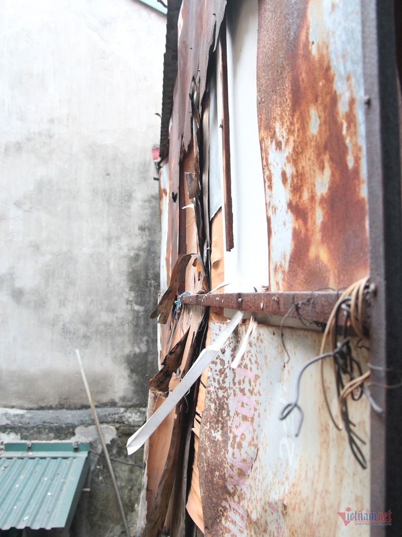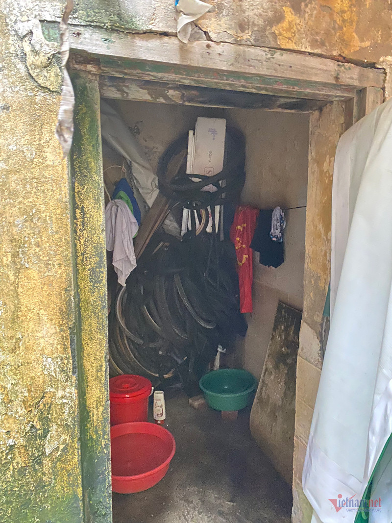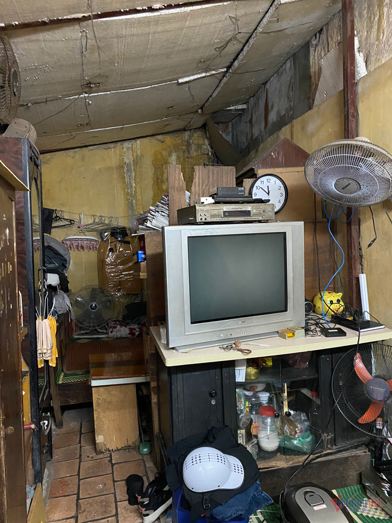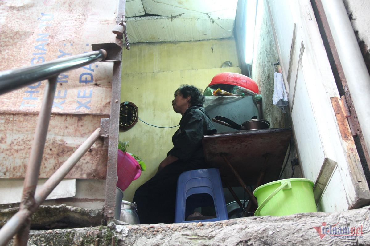 Bà Sâm cho hay, trong ngõ có nhiều hộ gia đình, chỉ có nhà ông bà là sống ở trên nóc nhà vệ sinh và cũng là sân phơi ngày trước. Căn phòng rộng khoảng 10m2, được quây lại bằng cót ép. Tường đã bong tróc, ẩm mốc. Nóc tủ được tận dụng làm bàn thờ. Trong phòng có duy nhất một chiếc giường, còn lại bà trải chiếu ở dưới sàn đề nằm cho tiện. Mọi sinh hoạt gia đình đều ở trong căn phòng ấy.