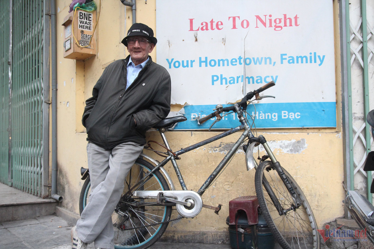 Đến phố Hàng Bạc (Hoàn Kiếm, Hà Nội), chúng tôi không khó để gặp được ông Nguyễn Phùng Hải (88 tuổi). Bởi mỗi ngày, ông Hải đều đứng cạnh chiếc xe đạp tự chế ở góc con phố, đợi khách đến bơm vá xe.