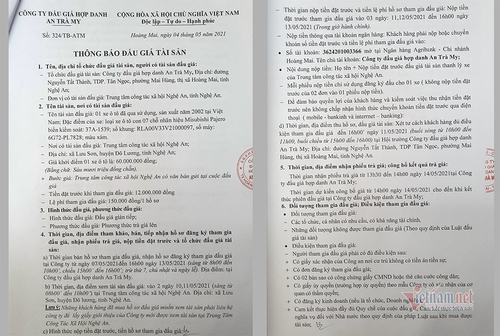 Trao đổi với PV VietNamNet, ông Lê Trung Thực, Giám đốc Trung tâm Công tác Xã hội (Sở LĐ-TB&XH Nghệ An) cho biết, ngày 18/3/2021, đơn vị phát thông báo về việc lựa chọn tổ chức đấu giá tài sản chiếc xe 7 chỗ, nhãn hiệu Misubishi PAJRO, định giá khởi điểm 60 triệu đồng.