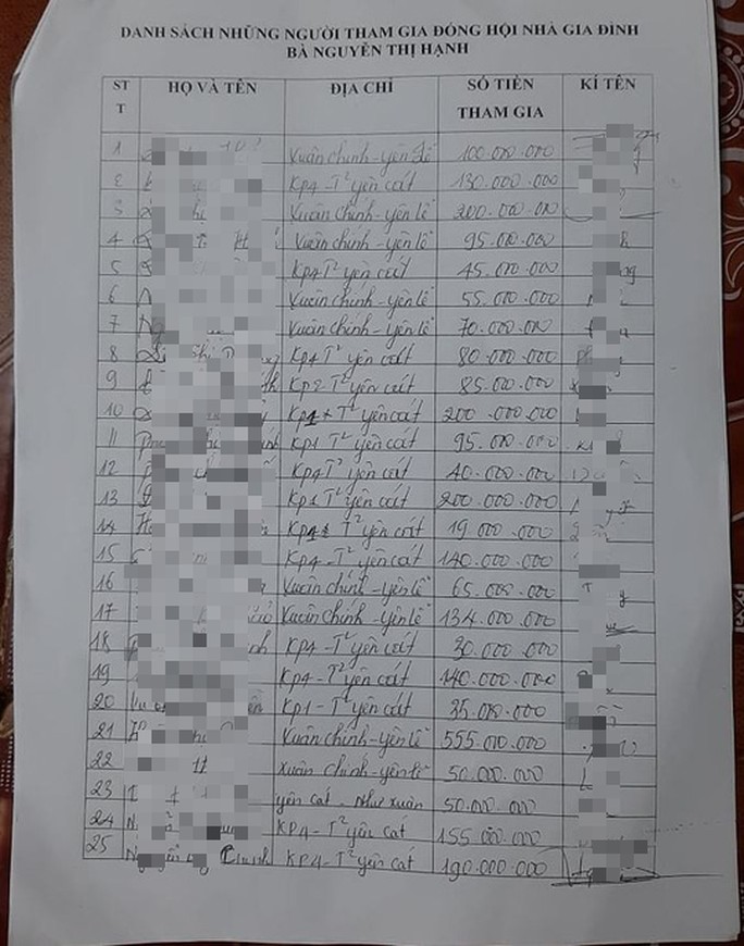 Anh Lê Khắc Dũng (SN 1994, ngụ xã Yên Lễ, huyện Như Xuân) cho biết anh chơi hụi với gia đình bà Hạnh và đã đóng được 11 tháng, mỗi tháng 15 triệu đồng. Thế nhưng, khi đến lượt anh lấy tiền thì bà Hạnh không chi trả, quanh co khất nợ. Tổng số tiền anh Dũng đóng hiện không lấy được là 165 triệu đồng.