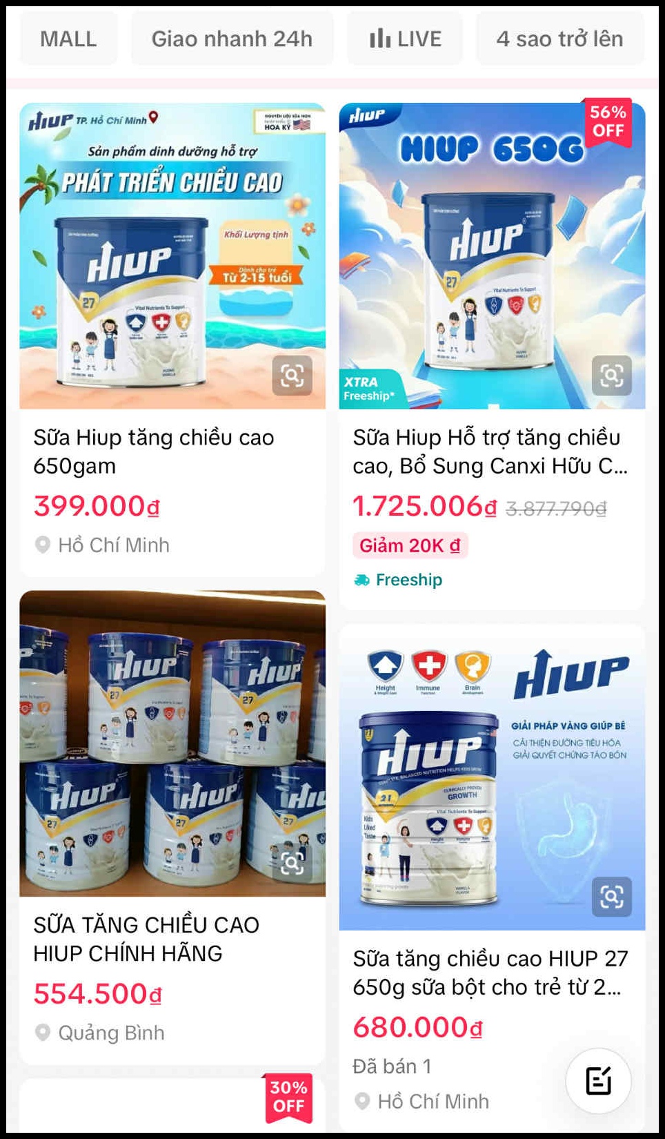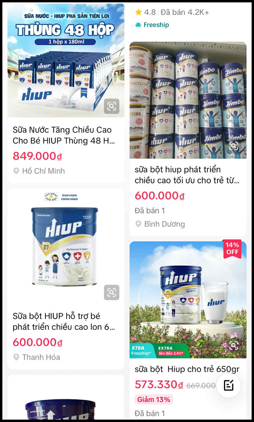 Theo ghi nhận vào sáng ngày 21/6, cả sữa lon và sữa pha sẵn HIUP vẫn được bày bán trên một số website và nền tảng TMĐT. Đây là gian hàng của đại lý, không phải kênh chính chủ HIUP bán. Tại đây, sản phẩm có giá bán đa dạng, dao động từ khoảng 400.000 - 600.000/ lon, thậm chí có nơi còn bán từ 800.000 - 1 triệu đồng/ lon.