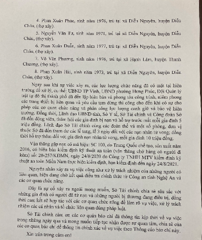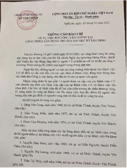 Sáng ngày 6-1, trao đổi với phóng viên Báo Người Lao Động, ông Nguyễn Xuân Hải, Giám đốc Sở Tài chính Nghệ An, cho biết đơn vị vừa có thông cáo báo chí về việc rơi lồng vận thăng tại công trình xây dựng trụ sở làm việc của Sở nkhiến 11 người thương vong xảy ra vào ngày 2-11.