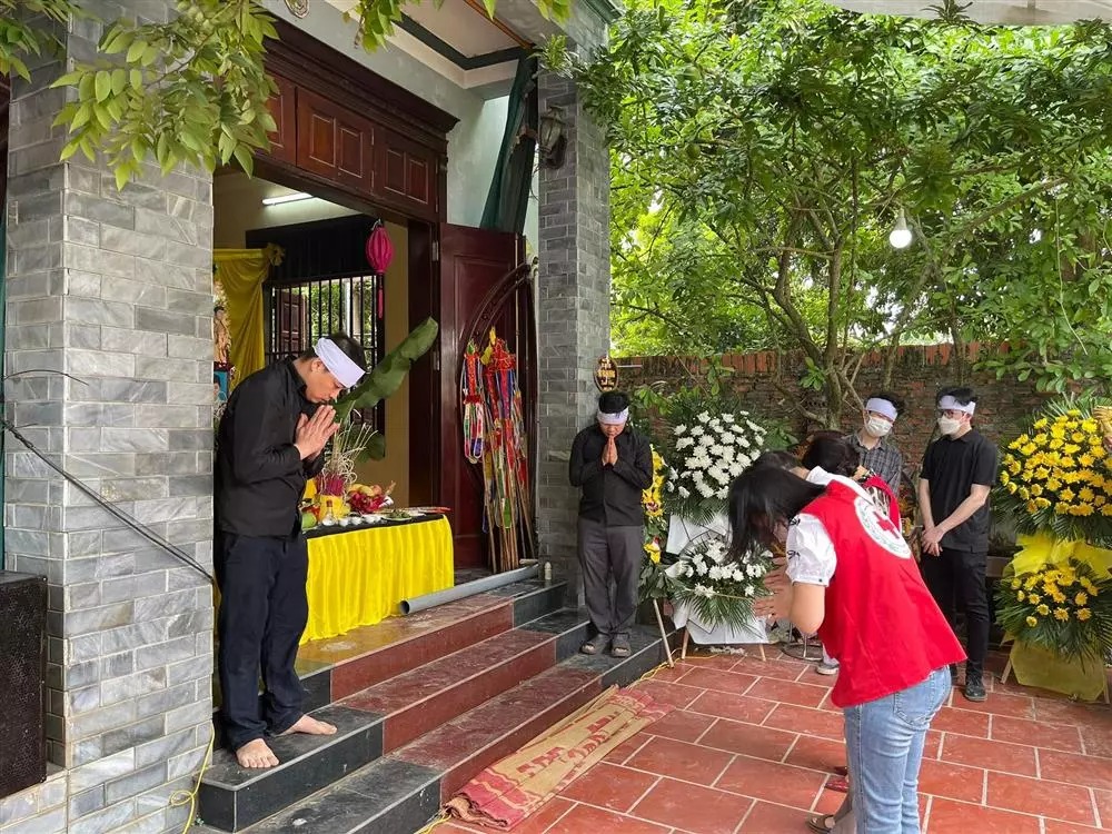 Trong tang lễ, anh Phùng Giang S. (32 tuổi, chồng chị H.) chắp tay cúi đầu cảm ơn từng người dân đến đưa tiễn vợ và 2 con. Anh chết lặng vì đau khổ, mặc áo xô trắng và đeo khăn tang.