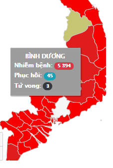 Theo thống kê từ Bộ Y tế, tính đến 15h ngày 23/7, tổng số ca mắc Covid-19 ở Bình Dương ghi nhận 5.394 ca, số bệnh nhân Covid-19 tử vong là 3 người và 45 người đã được chữa khỏi.