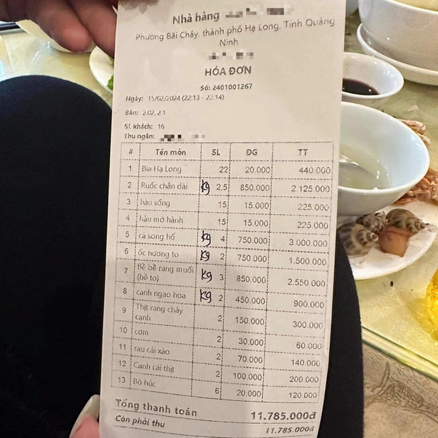 Vụ việc nhà hàng hải sản ở Hạ Long bị tố “chặt chém" bữa ăn hết hơn 11 triệu vào mùng 6 Tết nhận được sự quan tâm đặc biệt của dư luận. Theo hóa đơn, bữa ăn của đoàn khách dùng hết tổng cộng 13 món (bao gồm cả nước ngọt), gồm: ruốc chân dài giá 850.000 đồng/kg, hàu sống và hàu mỡ hành 15.000 đồng/con, cá song hổ 750.000 đồng/kg; ốc hương to 750.000 đồng/kg, bề bề to rang muối 850.000 đồng/kg, ngao hoa 450.000 đồng/kg cùng một số món khác. Tổng tiền thanh toán bữa ăn hết 11.785.000 đồng.