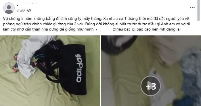 Anh Q. – người chồng bị vợ “cắm sừng” chia sẻ câu chuyện đau lòng: “Vợ chồng 5 năm không bằng đi làm công ty mấy tháng. Xa nhau có 1 tháng thôi mà đã dắt người yêu về phòng ngủ trên chính chiếc giường của 2 vợ chồng. Đúng đời không ai biết trước được điều gì. Anh em có vợ đi làm công ty nhớ cẩn thận nha đừng để giống như mình”.