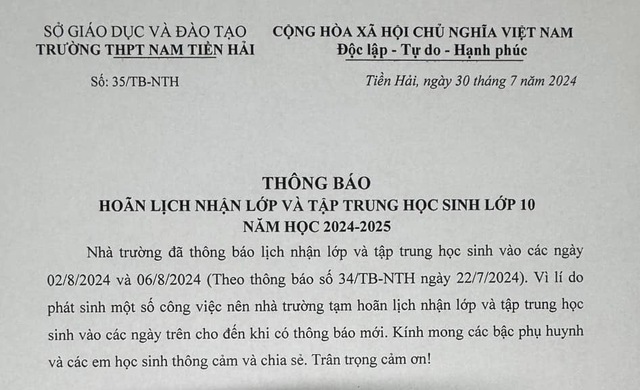 Còn trường THPT Nam Tiền Hải thì đã ra thông báo hoãn lịch nhận lớp và tập trung học sinh lớp 10 ngay từ khi có thông tin thanh tra điểm thi vào lớp 10. Hiện trường cũng đang chờ kết luận thanh tra. Việc nhận lớp và tập trung học sinh lớp 10 sẽ được thông báo khi có lịch cụ thể.