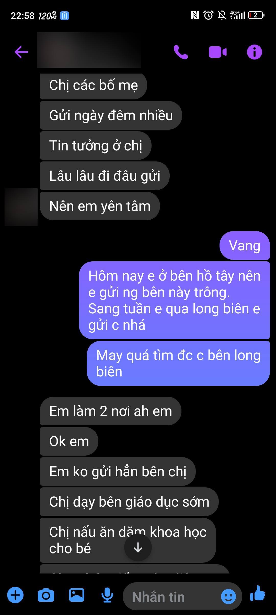 Trước đó, chị H. (ở phường Giang Biên, Long Biên, Hà Nội) do bận công tác xa nên lên mạng tìm người để gửi con nhỏ 5 tháng tuổi trong ngày 15/2 và 16/2. Sau khi trao đổi thống nhất với N., người tự nhận là giáo viên mầm non và gửi một số hình ảnh đang chăm sóc trẻ tại nhà với giá ban ngày là 150.000 đồng/ngày, ban đêm là 250.000 đồng/đêm.