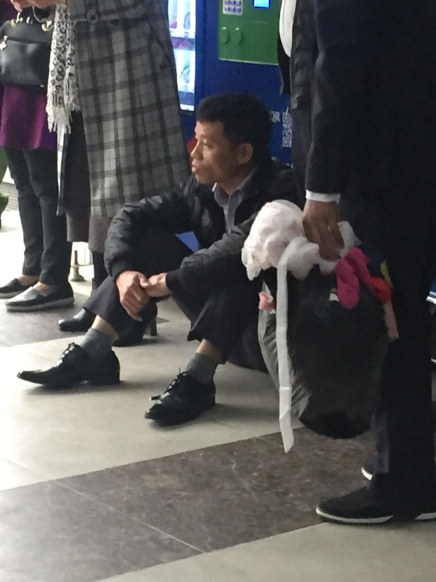 Bố cháu bé ngồi gục dưới sảnh của tòa nhà, không nói nên lời, người thân phải dìu đi.