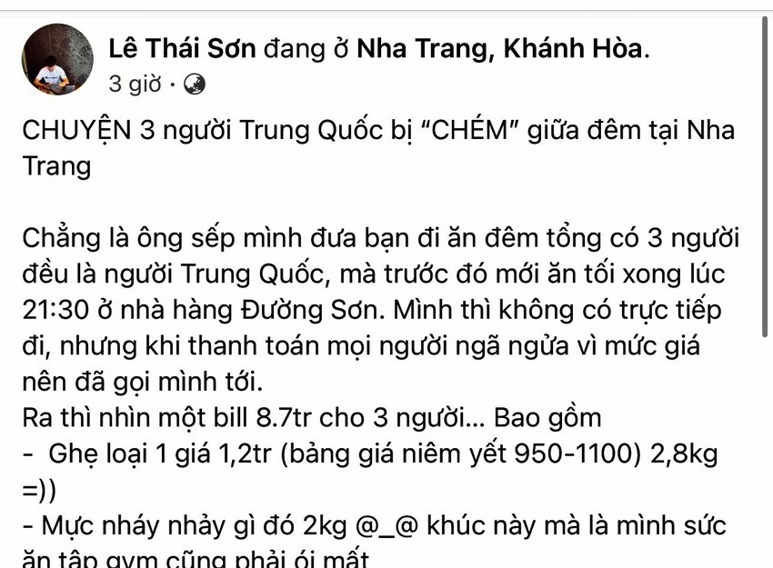 Liên quan tới sự việc, Pháp luật TP.HCM đã đưa tin, ngày 10-4, anh Lê Thái Sơn đăng trên mạng xã hội phản ánh tối 9-4, sếp của anh Sơn là người Trung Quốc đưa bạn đến ăn tối tại nhà hàng hải sản trên đường Trần Phú, TP Nha Trang.