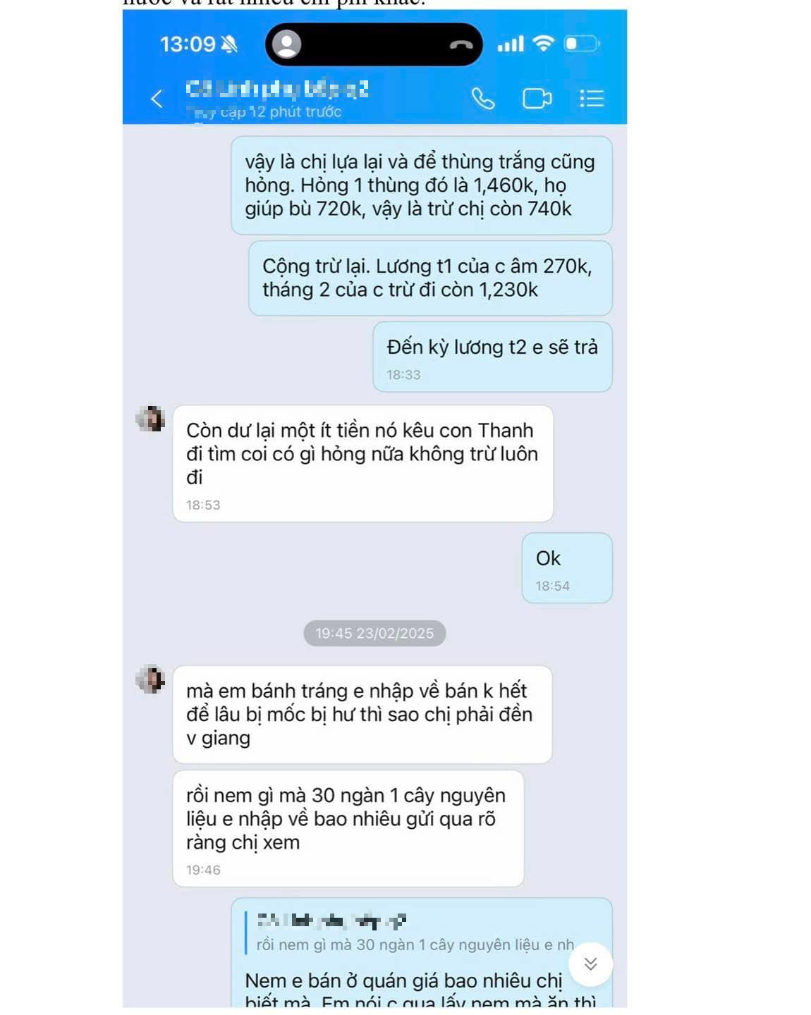 Người này thừa nhận việc trừ tiền nhân viên là quản lý nghiêm khắc nhưng khi cô L. thắc mắc việc bánh tráng hỏng là do quá trình bảo quản nhưng lại phải chịu toàn bộ phần đền bù thì người này không chấp nhận. Trong khi ở phần bài đăng, người này cho biết 1 tuần cô L. chỉ gói 2 lần nem mỗi lần 80-86 chiếc, cùng làm giấm tỏi chứ không phải phụ trách gói toàn bộ nem. Nên việc cô L. phải chịu đền bù cho phần bánh tráng bị hỏng lên đến 1,6 triệu đồng là điều chưa hợp lý.