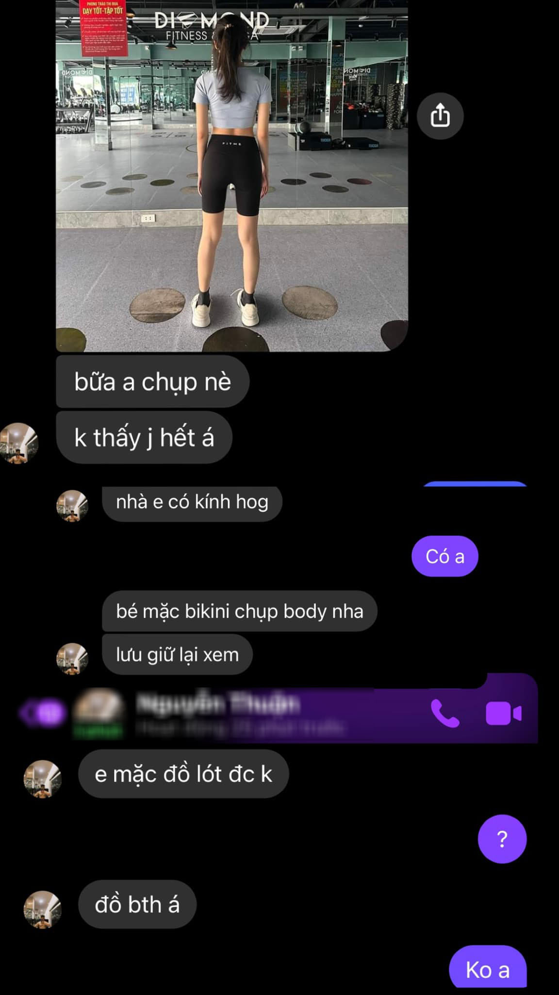 Đ.N. cũng chia sẻ thêm, cô bị sốc trước những lời lẽ mà anh PT này nhắn cho cô. Một trung tâm lớn và uy tín như vậy, không hiểu sao PT lại yêu cầu người tập chụp ảnh từ bikini đến đồ lót, trong khi tất cả đều là những trang phục nhạy cảm không liên quan gì đến quá trình tập luyện của cô.