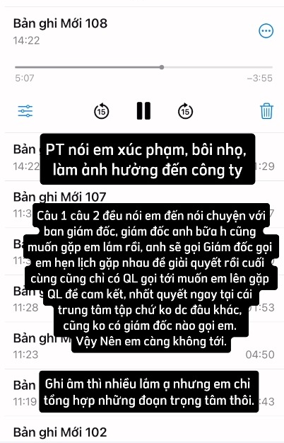 Tối đó PT 'hù dọa' em sẽ tự tử nếu em không xóa bài. Đến hôm sau, mới 6 giờ sáng PT đã gọi em và spam tới 20 - 30 cuộc gọi, tin nhắn. Cũng ngay hôm đó, em gọi điện trao đổi với quản lý về sự việc này.