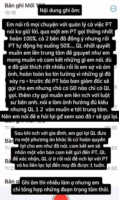Trao đổi đến đây, quản lý bảo sẽ nói chuyện lại với PT để thống nhất. Và đến nay đã một tuần trôi qua, từ PT đến quản lý đều im lặng. "Nếu thật sự quản lý và PT muốn giải quyết cho em thì đã hoàn trả 50% còn lại như lúc đầu, không nhất thiết phải bắt em lên trung tâm như vậy" - Đ.N. phản ánh lại sự việc.