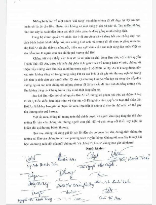 Trong bức thư, nhóm người này bày tỏ mong muốn Đảng bộ, chính quyền, người dân Hội An rộng lòng tha thứ cho những việc làm "nông nổi, thiếu suy nghĩ bồng bột của nhóm".