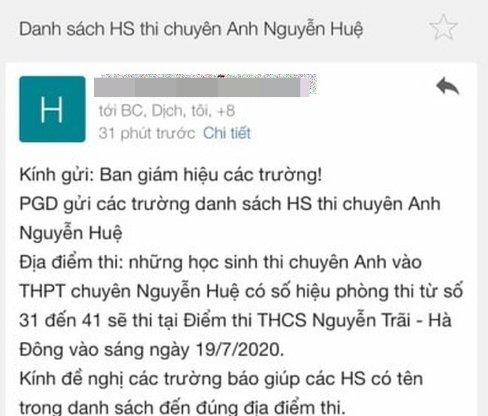 Sau khi nhận được thông tin còn có học sinh chưa rõ địa điểm dự thi môn chuyên tiếng Anh vào trường THPT chuyên Nguyễn Huệ, sở GD&ĐT đã kịp thời chỉ đạo phòng GD&ĐT Cầu Giấy rà soát, thông tin đến phụ huynh và học sinh để đảm bảo quyền lợi cho học sinh.