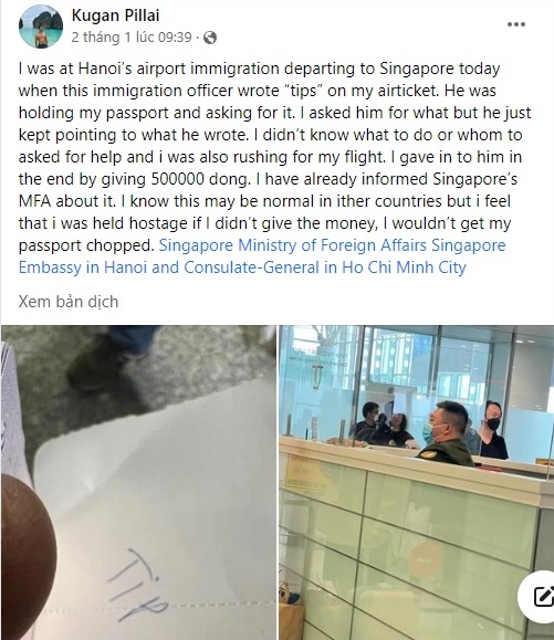 Ngày 2/1, tài khoản Facebook tên Kugan Pillai đã đăng tải bài viết lên lên trang cá nhân, kể lại trải nghiệm bị nhân viên xuất nhập cảnh đòi tiền tip.