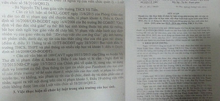 Cụ thể: "Cô Loan vi phạm quy chế chuyên môn, vi phạm khoản 4, Điều 6 Quy định số 16/2008/QĐ – BGDĐT “Quy định về đạo đức nhà giáo”;