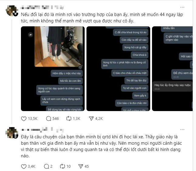 Trong các đoạn tin nhắn chia sẻ về vụ việc được tài khoản trên đăng tải, một học viên (được cho là nạn nhân) cho biết dù đã cảnh giác, ghì chặt tay vào vô lăng nhưng vẫn bị thầy áp sát, thực hiện cách hành động tế nhị. Cũng theo người đăng tải bài viết, sau khi thông tin được đăng tải lên MXH, đã có nhiều người khác nhắn tin tới tài khoản trên cho biết cũng từng bị thầy giáo này có hành động tương tự.