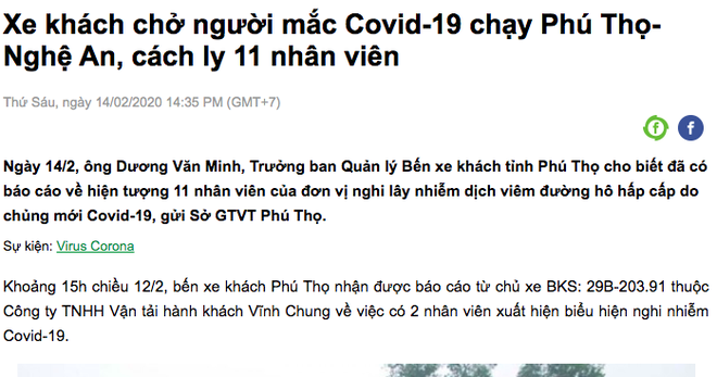 Ngày 14/2, có thông tin trên một số phương tiện truyền thông về việc xe khách mang BKS 29B - 203.91 thuộc Công ty TNHH VTHK Vinh Chung chạy tuyến Việt Trì (Phú Thọ) - Thái Hoà (Nghệ An) đầu tháng 2/2020 có chở nam hành khách nhiễm virus Corona, và sau đó có 1 phụ xe, 1 lái xe xuất hiện biểu hiện ho, sốt.