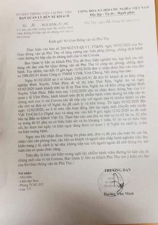 Văn bản số 11 của Ban quản lý Bến xe khách Phú Thọ nêu: Vào ngày 1/2, xe ô tô khách 29B - 203.19 của Công ty TNHH vận tải hành khách Vinh Chung đã đón 1 khách đi từ khu công nghiệp Bình Xuyên (Vĩnh Phúc) đi về thị trấn Thái Hòa, Nghệ An.
