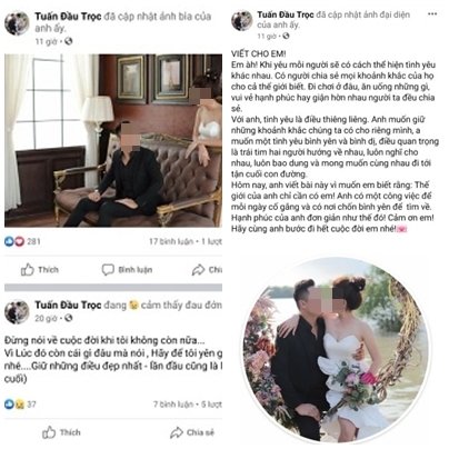 Ngoài ra, Facebook “Tuấn Đầu Trọc” còn cập nhật ảnh bìa là hình cưới của H. và chị U., kèm theo trạng thái “đang cảm thấy đau đớn” và dòng chia sẻ: “Đừng nói về cuộc đời khi tôi không còn nữa…Vì lúc đó còn cái gì đâu mà nói. Hãy để tôi yên giấc nhé…Giữ những điều đẹp nhất - Lần đầu cũng là lần cuối”...