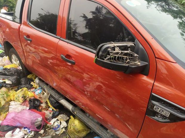 Chiếc xe sau đó được một người dân ở phường Trung Đô (TP Vinh) phát hiện nằm ở bãi rác trong tình trạng nổ lốp, móp quanh xe, mất đèn hậu và ốp gương.