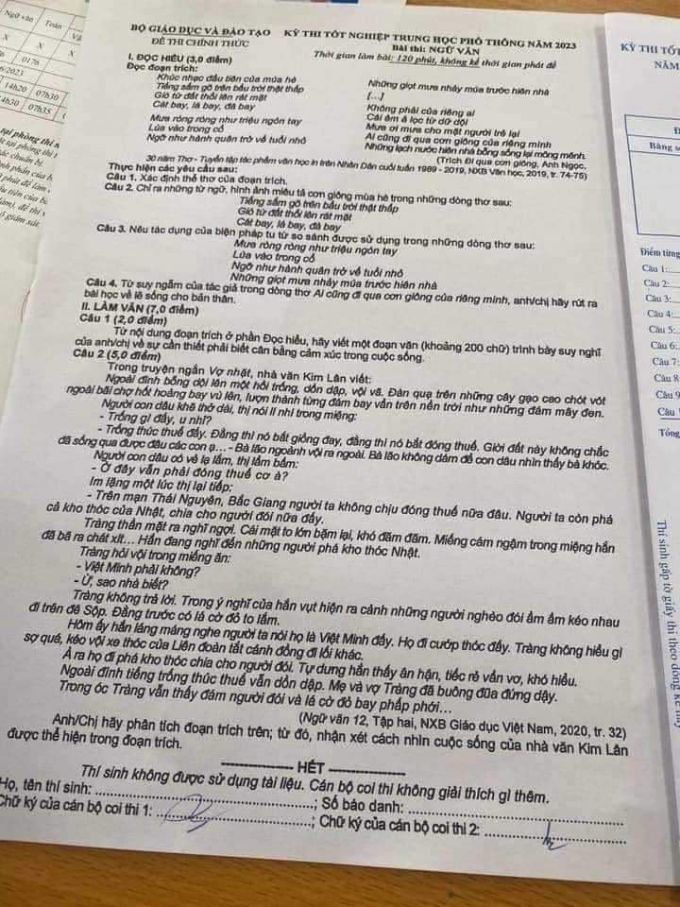 Sáng nay, Bộ Giáo dục và Đào tạo cho biết đề Ngữ văn thi tốt nghiệp THPT năm 2023 đã được đăng tải lên mạng xã hội vào lúc hơn 8h. Hình ảnh chụp cho thấy đề được chụp trong phòng thi, bên cạnh là tờ giấy làm bài là tờ giấy báo dự thi. Trong khi đó, theo quy định, thời gian làm bài môn Ngữ văn từ 7h35 đến 9h35.