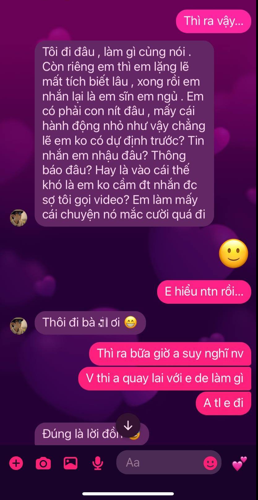 Quá phẫn uất vì nhiều lần bắt quả tang vợ ngoại tình nhưng A. vẫn không biết hối cải, anh S. cho biết: "Mình đâm đơn đơn phương, lý do đây nhé!". Anh còn nhấn mạnh đây chỉ là 1 trong số rất ít tin nhắn anh chụp được và thậm chí "còn nhiều hình ảnh lắm".