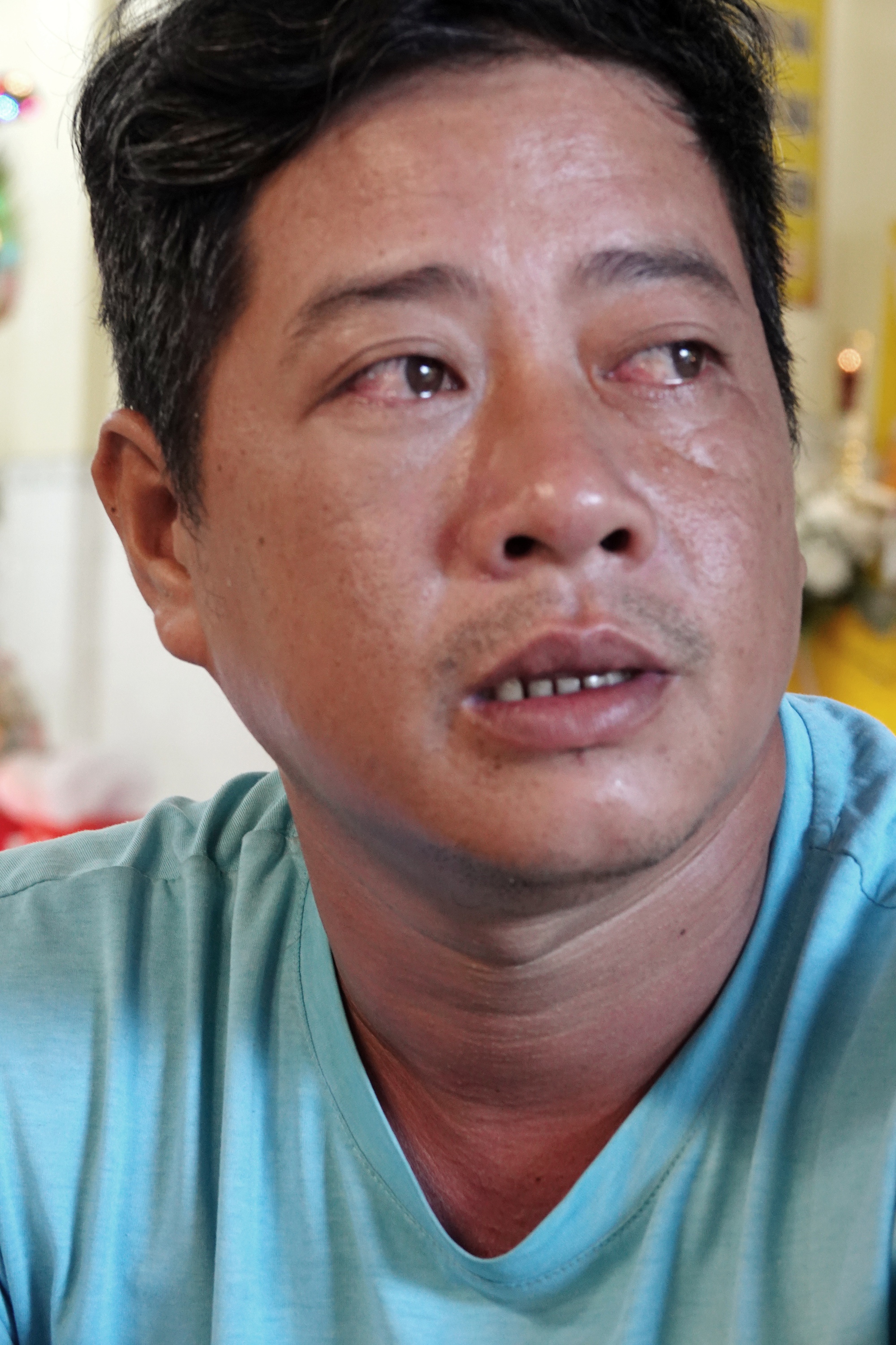 Ngồi trước ban thờ, anh Phạm Xuân Quang không khỏi xót xa rơi nước mắt trước sự ra đi đột ngột của người vợ và đàn đứa con thơ dại thậm chí còn chưa thể hiểu bi kịch vừa xảy ra, rằng người mẹ thân yêu đã mãi chẳng thể trở về.