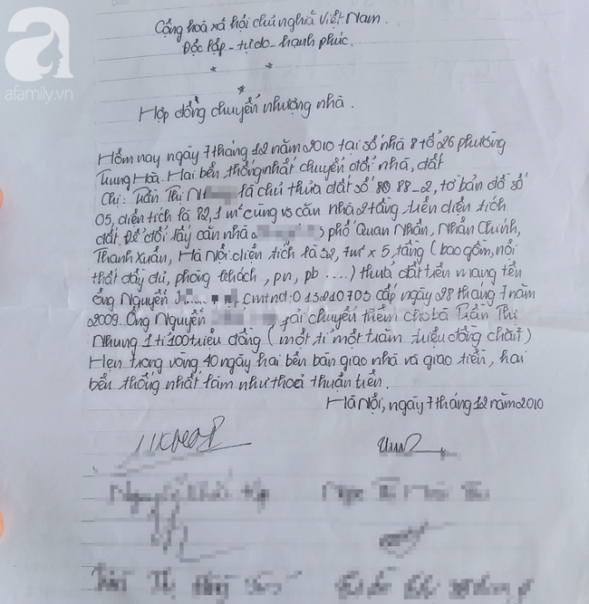 Người thân của bà Nh. cho biết, ngày viết giấy tờ cũng là ngày mẹ con chị Nh. về ở tại ngôi nhà trong ngõ 53 phố Quan Nhân chờ chủ cũ làm thủ tục sang tên. Trong thời gian này, toàn bộ giấy tờ cũ ở phường Trung Hòa, quận Cầu Giấy bà Nh. đã bàn giao cho ông H.