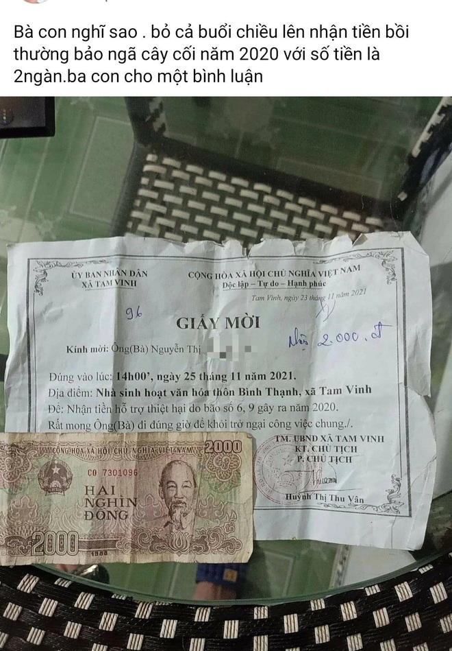 Theo quy định tại Nghị định 02/2017/NĐ-CP, diện tích cây công nghiệp và cây ăn quả lâu năm bị thiệt hại trên 70% thì hỗ trợ 4 triệu đồng/ha. "Như vậy, mức hỗ trợ theo quy định đối với hộ bà Truyện là 4 triệu đồng/10 m2, huyện cấp kinh phí hỗ trợ 53%, như vậy bà Truyện nhận hỗ trợ số tiền là 2.150 đồng" – UBND xã Tam Vinh giải thích.