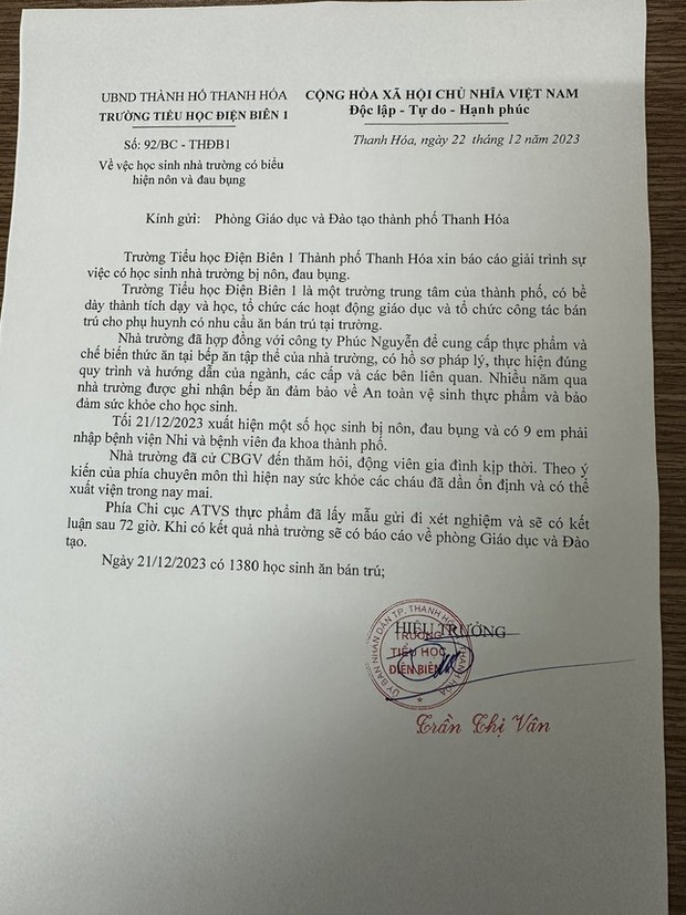 Trước đó, báo Tiền Phong đã thông tin sáng 22/12, bà Nguyễn Thị Oanh, Trưởng phòng Giáo dục và Đào tạo TP Thanh Hoá xác nhận thông tin, chiều 21/12, nhiều học sinh của Trường tiểu học Điện Biên 1, phường Điện Biên (TP Thanh Hoá) bị nhập viện với các biểu hiện đi ngoài, đau bụng...