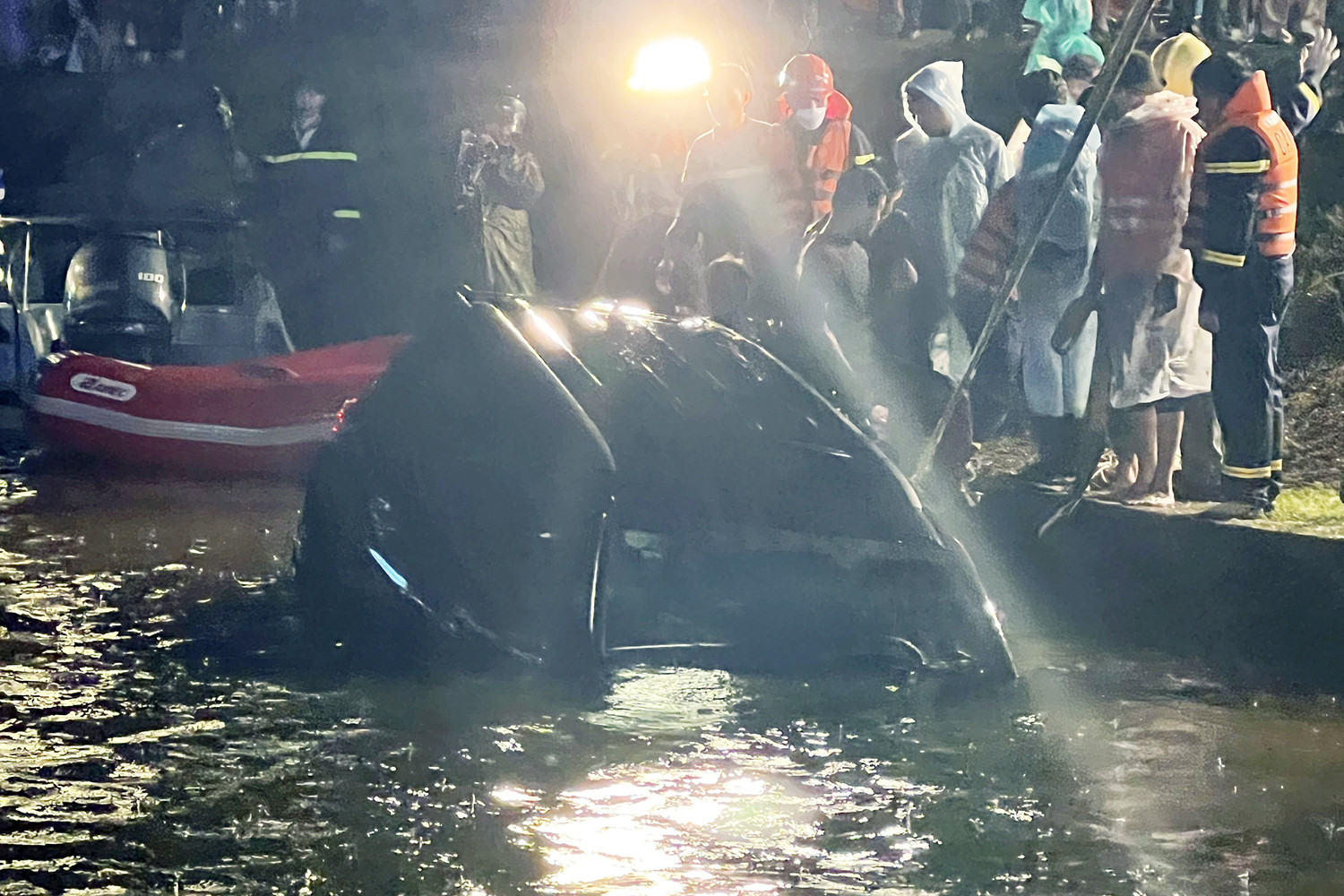 Lực lượng chức năng điều 3 xe cần cẩu chuyên dụng, hàng chục chiến sĩ cảnh sát triển khai công tác cứu nạn, cứu hộ trong điều kiện thời tiết xấu, có mưa, lạnh. Đến hơn 20 giờ cùng ngày, ô tô bị nạn đã được trục vớt lên khỏi mặt nước. Có 2 thi thể nạn nhân được tìm thấy trong xe gặp nạn.