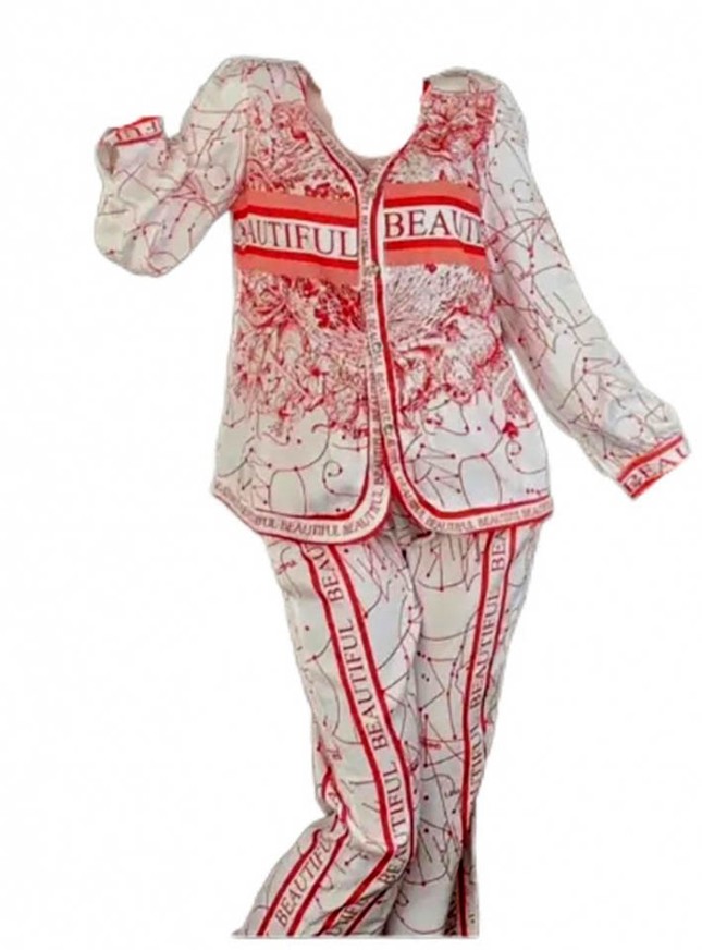 Thi thể khi được phát hiện mang bộ đồ trắng với nhiều chi tiết màu đỏ, có in chữ "BEAUTIFUL" màu đỏ; nhãn hiệu ở cổ áo có chữ "MONA" màu đen, nút cài thân áo và hai ống tay bằng nhựa.