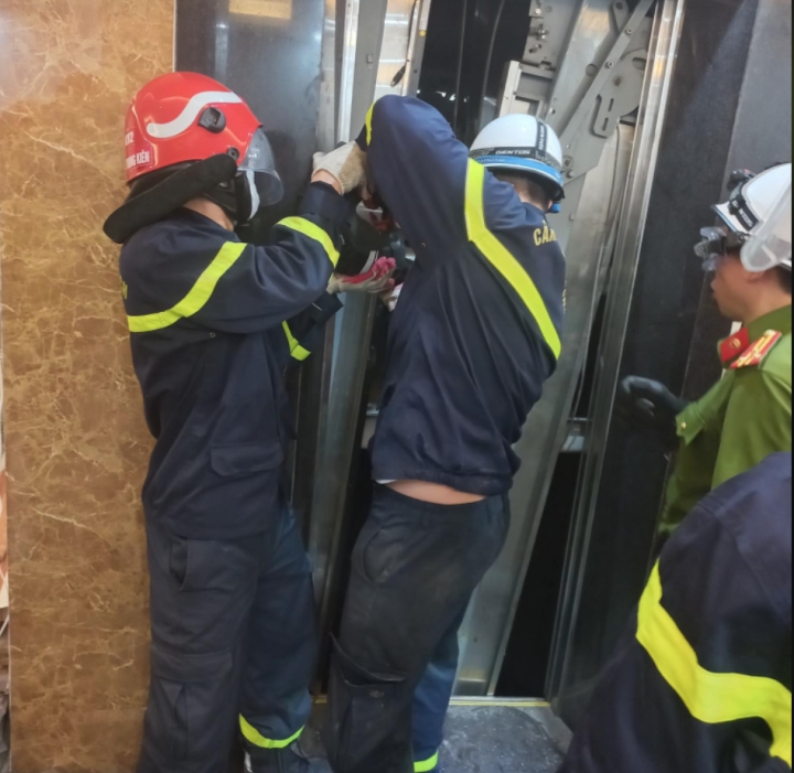 Ngay sau khi nhận được thông tin về vụ việc, lực lượng PCCC và CNCH khẩn trương đến hiện trường tiến hành giải cứu 2 nhân viên sửa chữa thang máy gặp sự số trong căn nhà dân cao 7 tầng 1 tum..