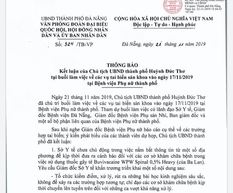 Văn bản do Chánh văn phòng Đoàn Ngọc Hùng Anh ký thể hiện, chiều 21/11, Chủ tịch UBND TP. Đà Nẵng Huỳnh Đức Thơ chủ trì buổi làm việc với sở Y tế, bệnh viện Phụ nữ và các đơn vị liên quan xung quanh vấn đề này.