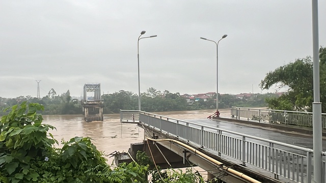 Theo ghi nhận phóng viên Báo Người Lao Động, sáng 10-9, tại khu vực cầu Phong Châu sập có xuất hiện mưa nhỏ, rải rác. Nước sông Hồng dâng cao, chảy xiết hơn hôm 9-9, khó khăn cho lực lượng chức năng.