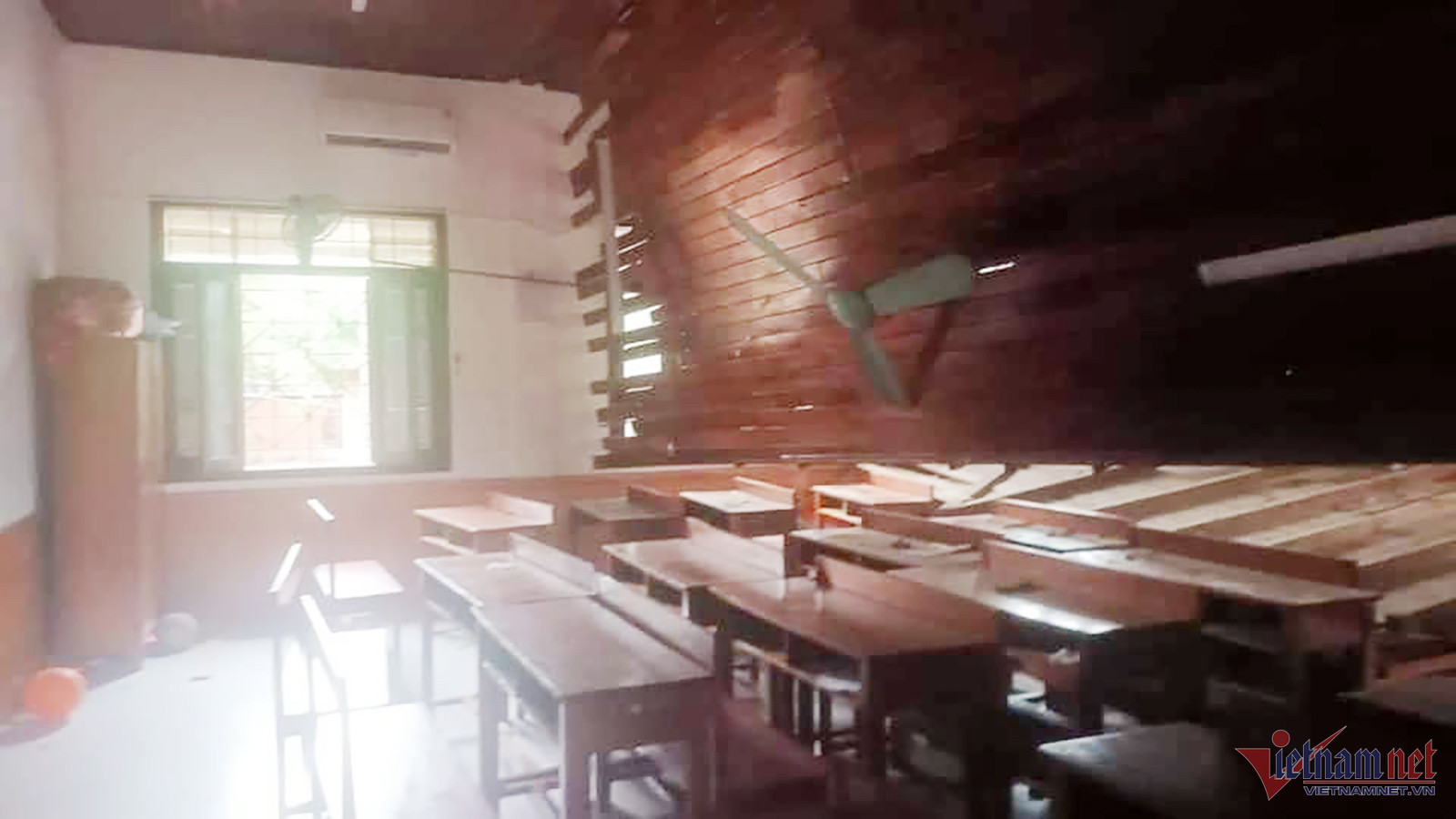 Ghi nhận hiện trường ở lớp học 11A9, trần gỗ, bờ tường gạch sập xuống nằm ngổn ngang. Hệ thống dây điện, quạt trần cũng bị hư hỏng.