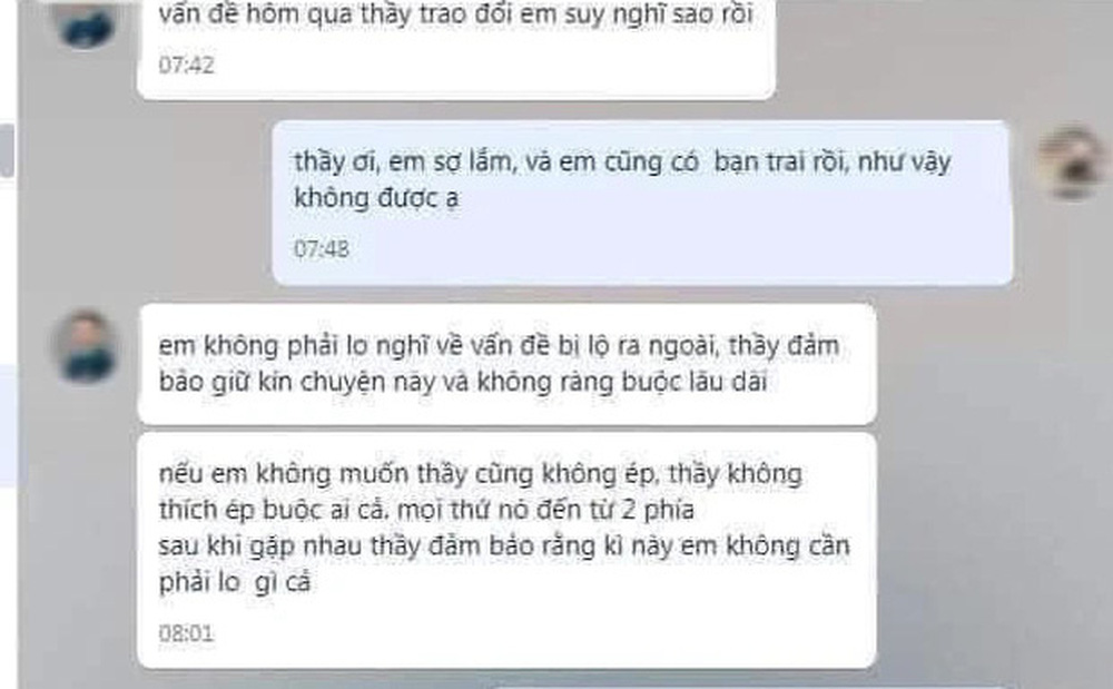 Tuy nhiên, thầy giáo đã đề nghị gặp nữ sinh ở quán cafe gần cổng trường sau đó lại hẹn gặp riêng một mình nữ sinh - tại khách sạn với yêu cầu "mọi thứ đến từ hai phía và không ép buộc gì cả".