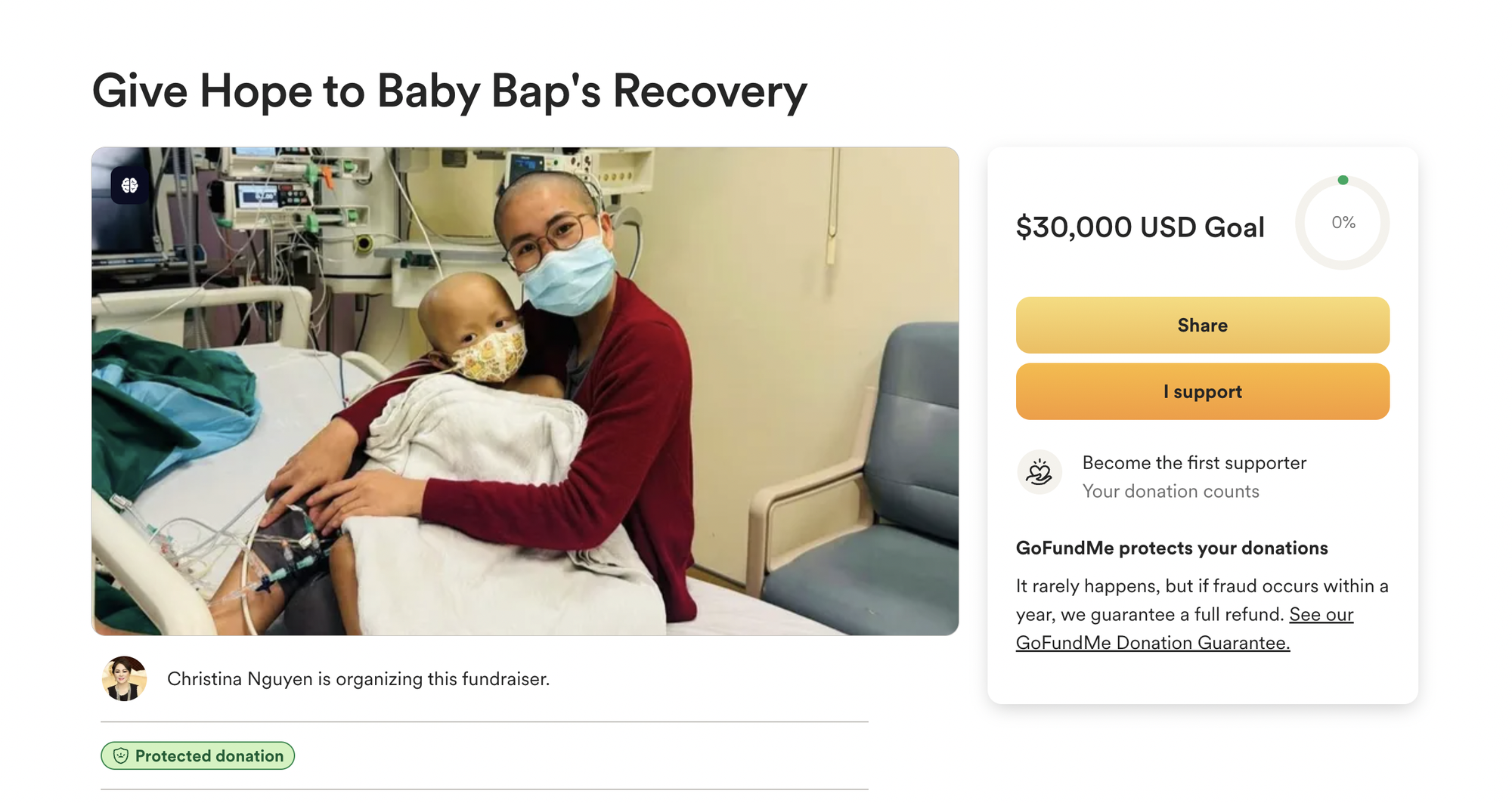 Liên quan hai chiến dịch lập quỹ kêu gọi từ thiện trên GoFundMe, chiến dịch đầu tiên xuất hiện mang tên "Give Hope to M.H: Fund His Treatment", do một người tự xưng là chú bé Bắp, Tam Bui Minh (Nevada, California), khởi xướng, đặt mục tiêu kêu gọi được 300.000 USD.